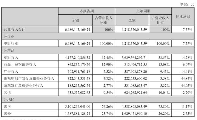 报告期内,公司国内直营影院实现票房42.1亿元(含服务费),同比增长19.2%;商品、餐饮销售收入收入为8.63亿元,较上年同期的8.13亿元增长6%;广告收入为5亿元,较上年同期的5.87亿元下降14.4%;
