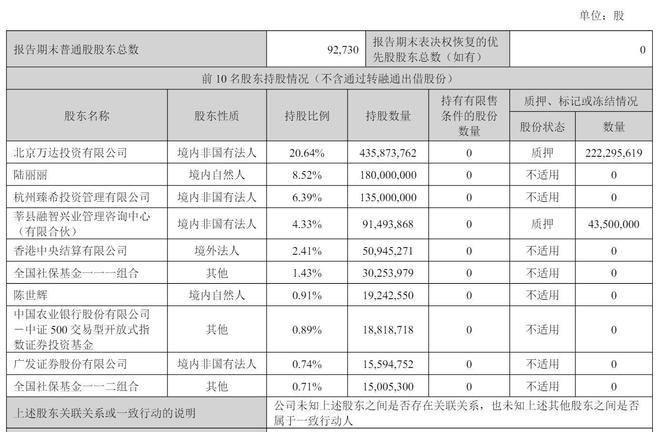 截至2025年6月30日,万达投资持股20.64%,陆丽丽持股为8.52%,杭州臻希投资管理有限公司持股6.39%,莘县融智兴业管理咨询中心(有限合伙)持股4.33%,香港中央结算有限公司持股为2.41%;