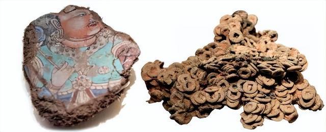 左图:木舒克市附近一处佛寺遗址内的壁画残块,唐代;