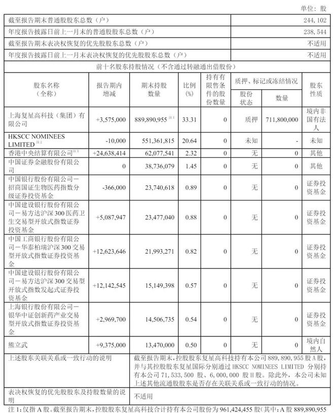 截至2025年6月30日,上海复星高科技(集团)有限公司持股为33.32%,HKSCC NOMINEES LIMITED持股为20.65%,香港中央结算有限公司持股为2.84%,中国证券金融股份有限公司持股为1.45%;