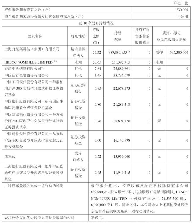 截至2024年12月31日,上海复星高科技(集团)有限公司持股为33.31%,HKSCC NOMINEES LIMITED持股为20.63%,香港中央结算有限公司持股为2.32%,中国证券金融股份有限公司持股为1.45%;