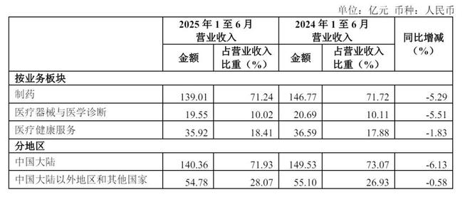 复星医药2025年上半年来自制药领域收入为139亿元,较上年同期的146.77亿元下降5.29%,占营收的比例为71.24%;