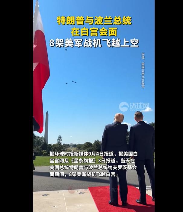 据美国白宫官网及《星条旗报》3日报道,当天在美国总统特朗普与波兰总统纳夫罗茨基会面期间,8架美军战机飞越白宫。