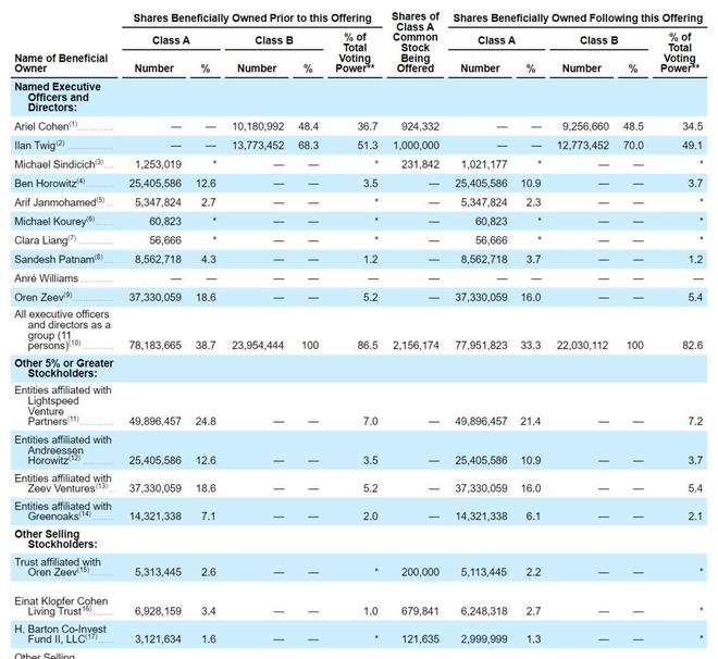 IPO后,Ilan Twig持有70%的B类股,有49.1%的投票权;Ben Horowitz持有10.9%的A类股,有3.7%的投票权;Oren Zeev持有16%的A类股,有5.4%的投票权;