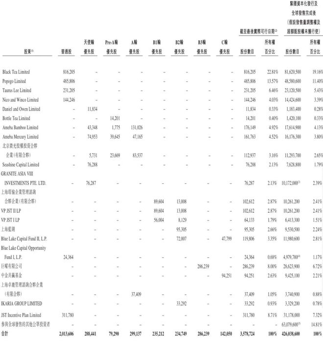 骆海东直接持股19.16%,贺兴建通过Popogo Limited持股11.4%,员工激励将发行的股份JST Incentive Plan Limited占比为7.32%,红杉智盛持股6.72%,李灿升持股为5.43%,上海晖巨管理咨询合伙企业有限公司持股为4.13%,AmebaChina持股为3.8%;