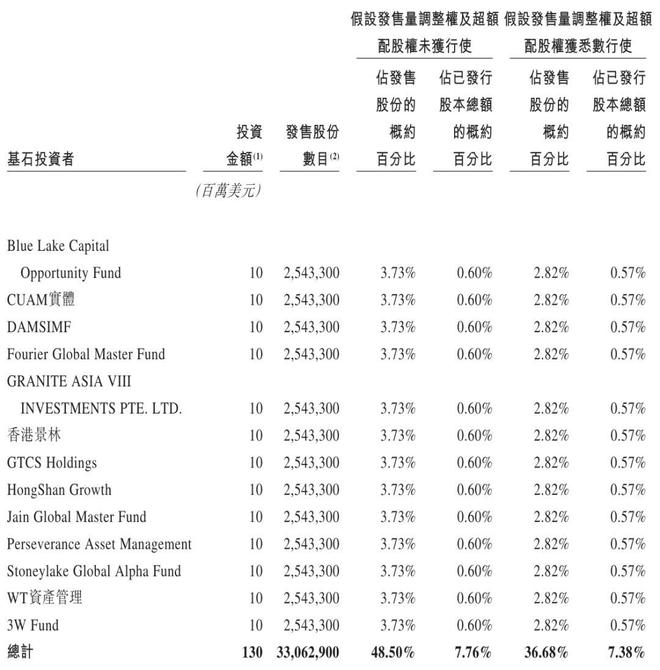 聚水潭基石投资者分别包括Blue Lake Capital Opportunity Fund、汇添富CUAM实体、DAMSIMF、Fourier Global Master Fund、GRANITE ASIA VIII INVESTMENTS PTE、香港景林、GTCS Holdings、HongShan Growth、Jain Global Master Fund、Perseverance Asset Management、Stoneylake Global Alpha Fund、WT资产管理、3W Fund,均分别认购1000万美元,一共认购1.3亿美元。