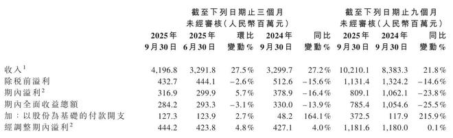 思摩尔2025年前9个月营收为102亿元,较上年同期的83.83亿元增长21.8%;期内利润为8.09亿元,较上年同期的10.62亿元下降23.8%;经调整净利为11.82亿元,与上年同期基本持平。