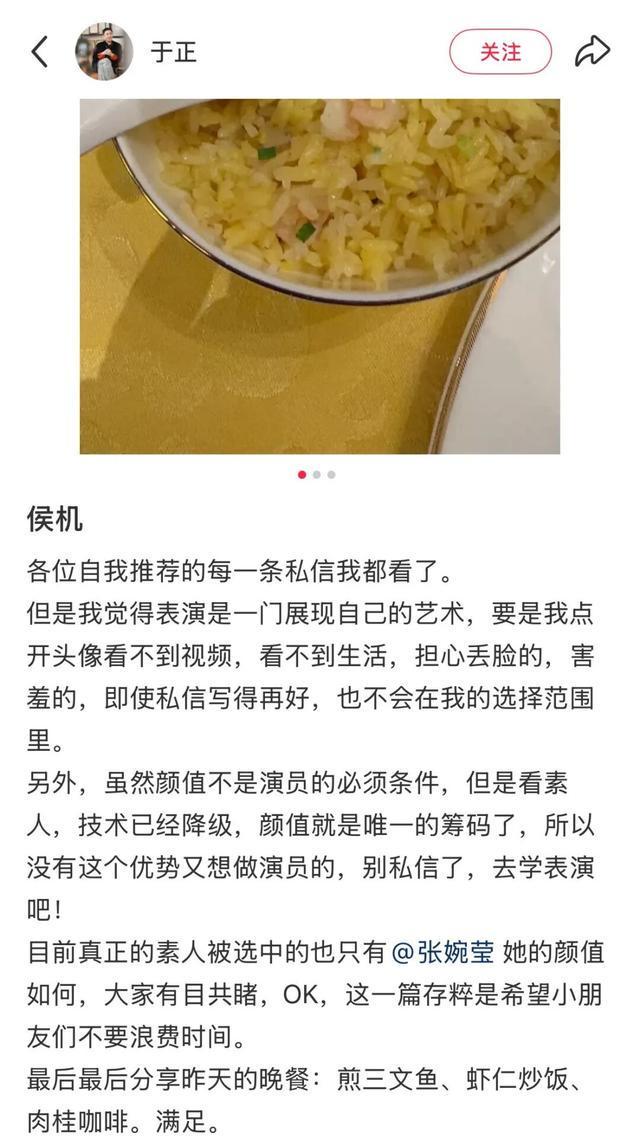于正劝退素人自荐演员强调实力至上,此前曾通过闲鱼招募素人演员引热议