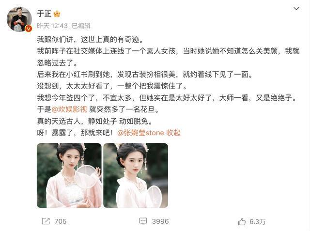 2024年10月,于正晒照官宣新签约素人美女张婉莹,大赞对方外貌“真的天选古人,静如处子动如脱兔”。随即有网友发现该女生曾是一名河南某高校教师。
