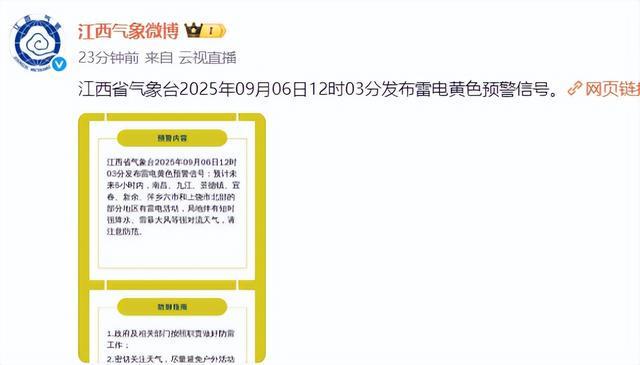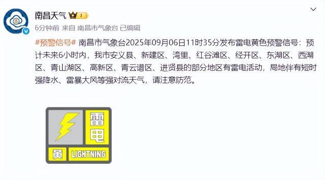此前,南昌市气象台2025年09月06日11时35分发布雷电黄色预警信号:预计未来6小时内,我市安义县、新建区、湾里、红谷滩区、经开区、东湖区、西湖区、青山湖区、高新区、青云谱区、进贤县的部分地区有雷电活动,局地伴有短时强降水、雷暴大风等强对流天气,请注意防范。