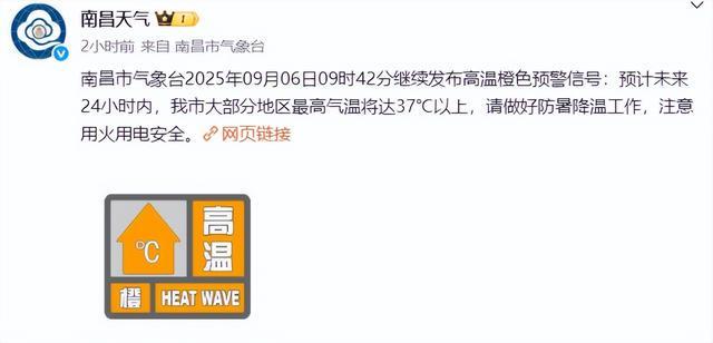 此外,南昌市气象台2025年09月06日09时42分继续发布高温橙色预警信号:预计未来24小时内,我市大部分地区最高气温将达37℃以上,请做好防暑降温工作,注意用火用电安全。
