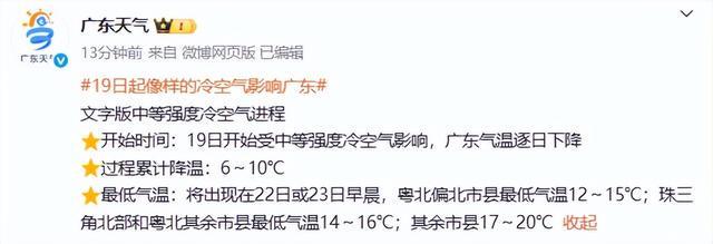 气象台预计,19日开始受中等强度冷空气影响,广东气温逐日下降,过程累计降温6~10℃。最低气温将出现在22日或23日早晨,粤北偏北市县最低气温12~15℃;珠三角北部和粤北其余市县最低气温14~16℃;其余市县17~20℃