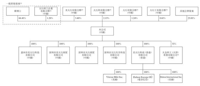 IPO后,韩德玮博士持股为66.41%,大行科工企业有限合伙持股为1.2%;韩德玮博士一共控制67.61%股权。