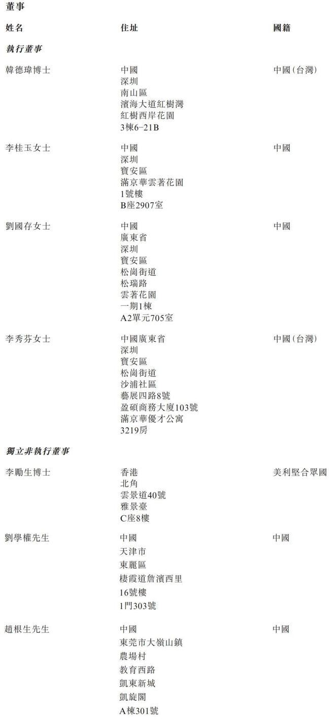大行科工执行董事分别为韩德玮博士、李桂玉女士、刘国存女士、李秀芬女士;独立非执行董事分别为李励生博士、刘学权、赵根生。