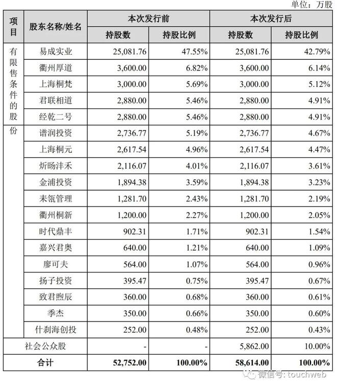 IPO后,易成实业持股为42.79%,衢州厚道持股为6.14%,上海桐梵持股为5.12%,君联相道、经乾二号分别持股为4.91%,谱润投资持股为4.67%,上海桐元持股为4.47%,炘旸沣禾持股为3.61%,金浦投资持股为3.23%,耒瓴管理持股为2.19%;
