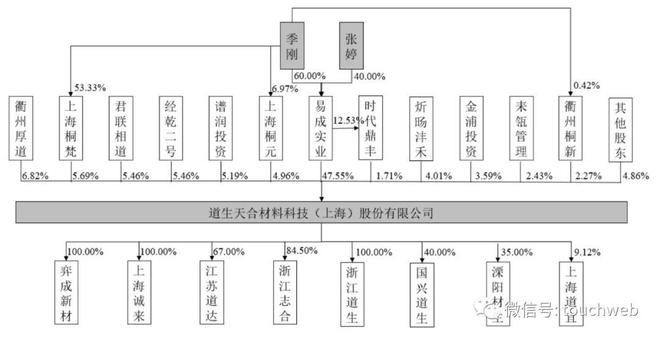IPO前,道生天合实际控制人季刚、张婷夫妇通过易成实业持有公司47.55%股份,季刚通过担任上海桐梵、上海桐元、衢州桐新执行事务合伙人分别控制公司5.69%、4.96%、2.27%表决权,共控制60.47%表决权。