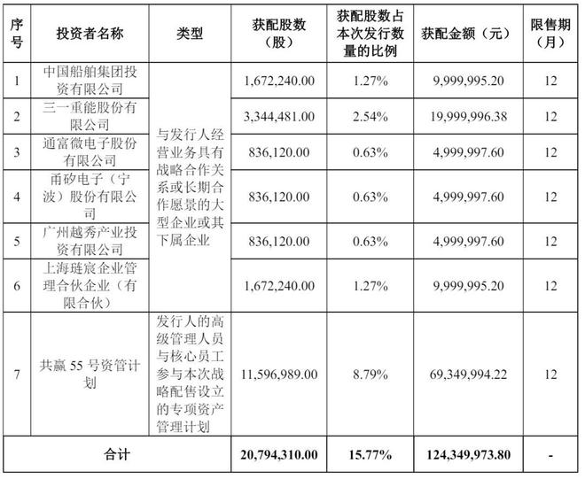 其中,中国船舶集团投资有限公司认购1000万元,三一重能股份有限公司认购2000万元,通富微电子股份有限公司、甬矽电子(宁波)股份有限公司、广州越秀产业投资有限公司分别认购500万元,上海琏宸企业管理合伙企业(有限合伙)认购1000万元,共赢 55 号资管计划认购6935万元。