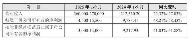 道生天合预计2025年前9个月营收为26亿到27亿,较上年同期的21.26亿元增长22.32%到27.03%;预计归属于母公司所有者的净利润为1.45亿到1.55亿元,较上年同期的9783万元增长48.21%到58.43%;预计扣非后净利为1.3亿到1.4亿元,较上年同期的9217.9万元增长41.03%到51.88%。