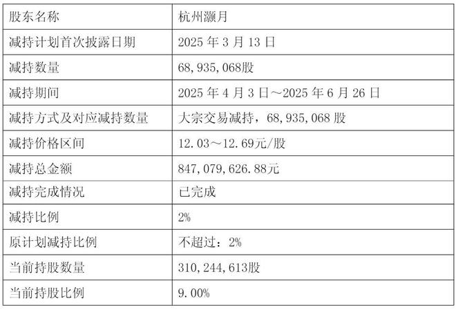 杭州灏月减持的均价为12.03元到12.69元,套现总额为8.47亿元。