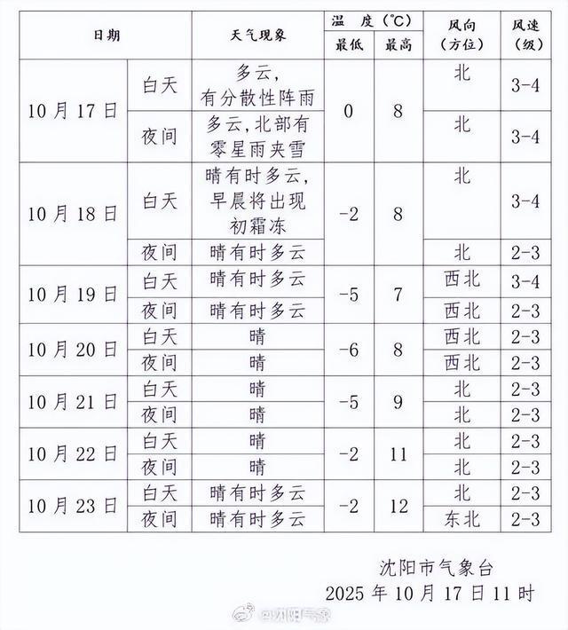 沈阳市气象台2025年10月17日5时30分发布