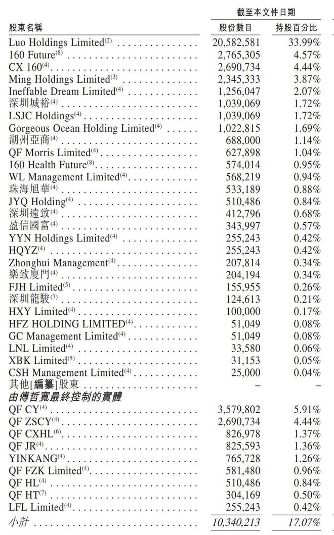 QF Morris Limited持股为1.04%,青岛立檀持股为0.98%,QF FZK Limited持股0.96%,160 Health Future持股为0.95%,WL Management Limited持股为0.94%,南京富睿持股为0.92%,珠海旭华持股为0.88%,JYQ Holding、QF HL分别持股为0.84%;