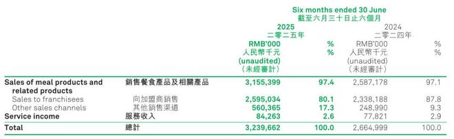 锅圈2025年上半年来自加盟商的收入为26亿元,占营收的比例为80.1%;来自其他渠道销售的收入为5.6亿元,占营收的比例为17.3%;来自服务的收入为8426万元,占比为2.6%。