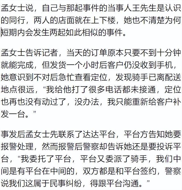 10月17日,贵阳的手机店店主孟女士向九派新闻反映称,自己13日在达达下单,让骑手帮忙配送一台苹果17promax至客户家中,不想却遭到了骑手跑单,骑手至今下落不明,本该送达给客户的手机也随之不翼而飞。