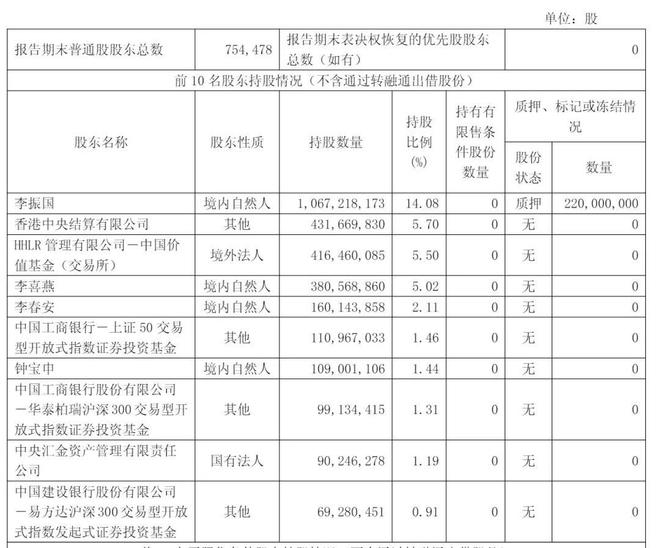 截至2025年3月31日,李振国持股14.08%,香港中央结算有限公司持股5.7%,高瓴旗下HHLR 管理有限公司-中国价值基金(交易所)持股为5.5%,李喜燕持股为5.02%,李春安持股为2.11%;
