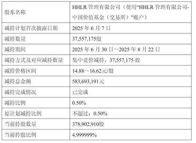 据公告显示,高瓴在2025年6月30日到2025年8月22日通过集中竞价的方式减持了37,557,175股,减持均价为14.88元到16.62元/股。