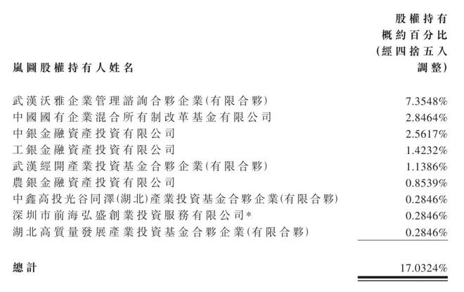 武汉沃雅企业管理咨询合伙企业(有限合伙)持股为7.3548%,中国国有企业混合所有制改革基金有限公司持股为2.8464%,中银金融资产投资有限公司持股为2.5617%,工银金融资产投资有限公司持股为1.4232%;