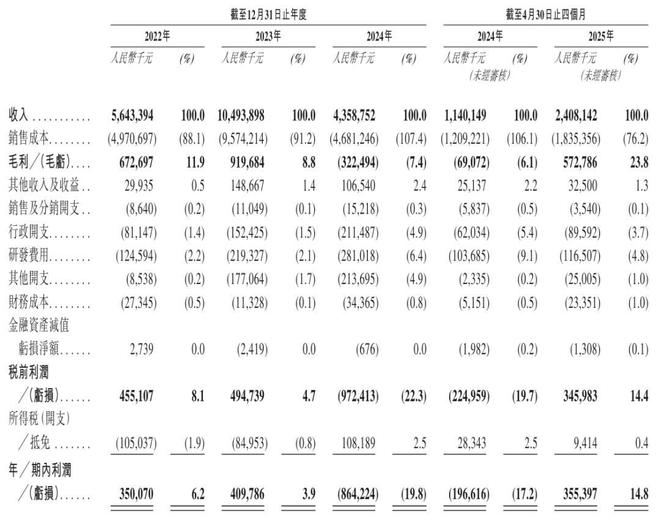 英发睿能2025年前4个月营收为24亿元,上年同期的营收为11.4亿元;毛利为5.73亿元,上年同期的毛利为-6907万元;毛利率为23.8%,上年同期的毛利率为-6.1%;期内利润为3.55亿元,上年同期的期内亏损为1.97亿元;期内利润率为14.8%,上年同期的期内利润率为-17.2%。