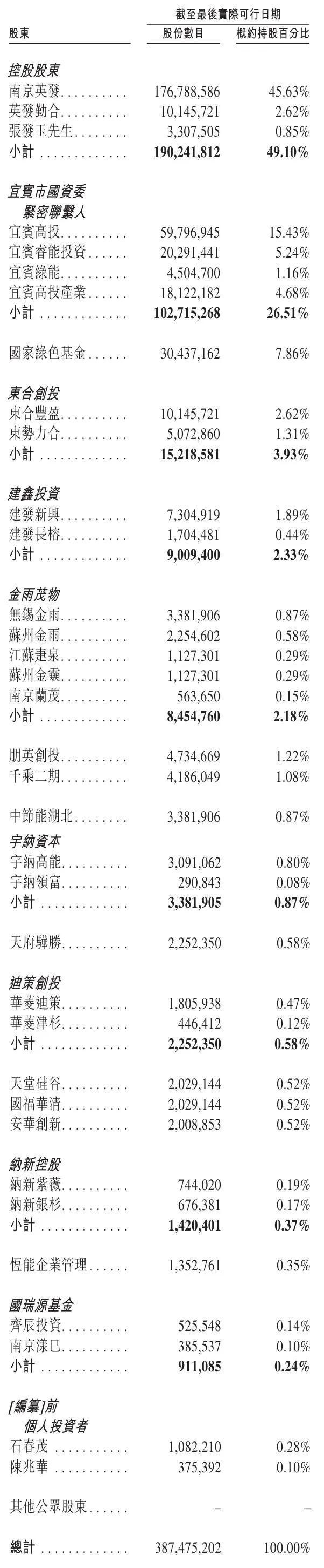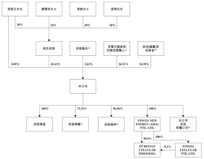 IPO前,南京英发持有英发睿能45.63%权益,南京英发由张发玉持有36%、罗宝英女士持有24%、张敏女士持有20%及张杰持有20%权益;英发勤合持有约2.62%权益,其普通合伙人为张发玉;及张发玉持有约0.85%权益。张发玉与罗宝英女士为配偶,且为张敏女士及张杰的父母(统称「张发玉家族」),张发玉家族控制公司49.1%股权。