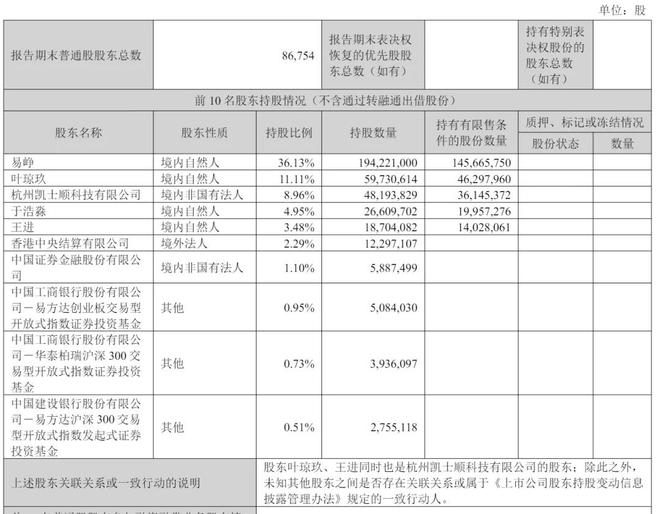 截至2025年6月30日,易峥持股36.13%,叶琼玖持股11.11%,杭州凯士顺科技有限公司持股8.96%,于浩淼持股4.95%,王进持股为3.48%;
