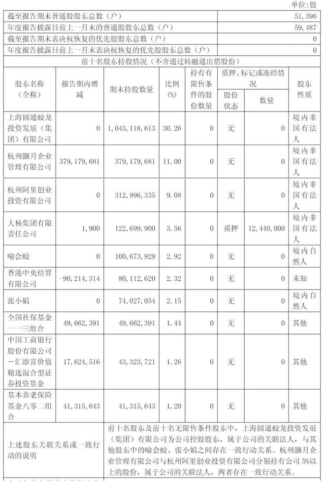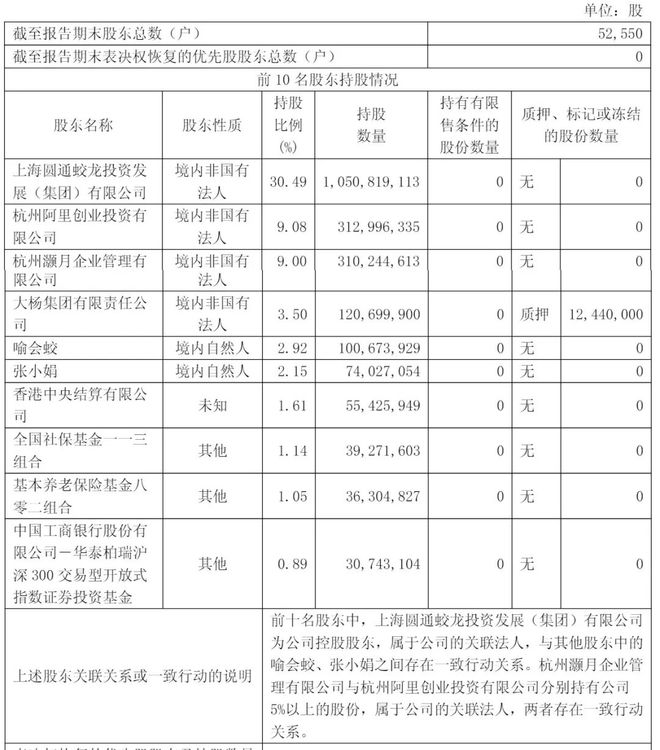 截至2024年12月31日,上海圆通蛟龙投资发展(集团)有限公司持股为30.26%,阿里旗下杭州灏月企业管理有限公司持股为11%,杭州阿里创业投资有限公司持股为9.08%,大杨集团有限责任公司持股为3.56%,喻会蛟持股为2.92%,香港中央结算有限公司持股为2.32%;