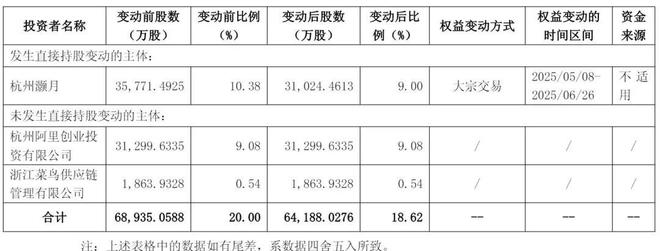 减持后,杭州灏月持股9%,杭州阿里创业投资有限公司持股9.08%,浙江菜鸟供应链管理有限公司持股为0.54%,一共持股为18.62%。本次权益变动后,杭州灏月及其一致行动人合计持股比例由20.62%变动至18.62%。