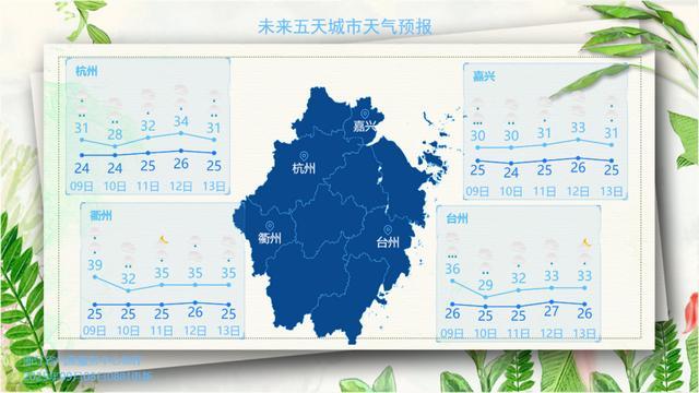 气温方面,明天起大部地区高温明显缓和,浙北地区最高气温29~32℃,浙中南地区最高气温35~37℃;10-11日全省大部最高气温29~32℃。