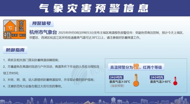 在副热带高压的强势控制下,杭州今年夏天热得旷日持久,热得后劲十足。而今天还要上演最后的疯狂,上午,杭州市气象台再次发布高温橙色预警信号,主城区所有街道最高气温可达38℃以上,请大家注意做好防暑降温工作。