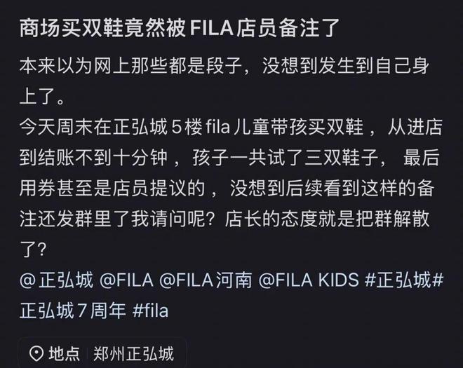 11月23日,有郑州网友发帖称,自己当日在郑州正弘城商场5楼FILA儿童店带孩子买鞋,“从进店到结账不到十分钟,孩子一共试了三双鞋子,最后用券甚至是店员提议的。”