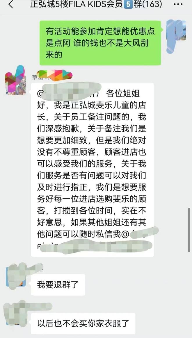 群聊记录显示,一名自称店长的群友发信息致歉:“关于员工备注问题的,我们深感抱歉,关于备注我们是想要更加细致,但是我们绝对没有不尊重顾客,顾客进店也可以感受我们的服务。关于我们服务是否有问题可以对我们及时进行指证,我们是想要服务好每一位进店选购斐乐的顾客,打搅到各位时间,实在不好意思。”