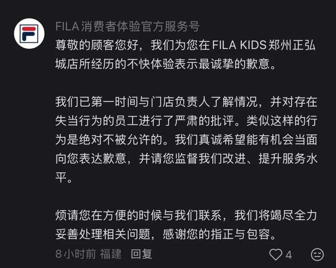 记者注意到,在网友帖子的评论区,FILA消费者体验官方服务号回复称,“尊敬的顾客您好,我们为您在FILA KIDS郑州正弘城店所经历的不快体验表示最诚挚的歉意。我们已第一时间与门店负责人了解情况,并对存在失当行为的员工进行了严肃的批评。类似这样的行为是绝对不被允许的。我们真诚希望能有机会当面向您表达歉意,并请您监督我们改进、提升服务水平。烦请您在方便的时候与我们联系,我们将竭尽全力妥善处理相关问题,感谢您的指正与包容。”