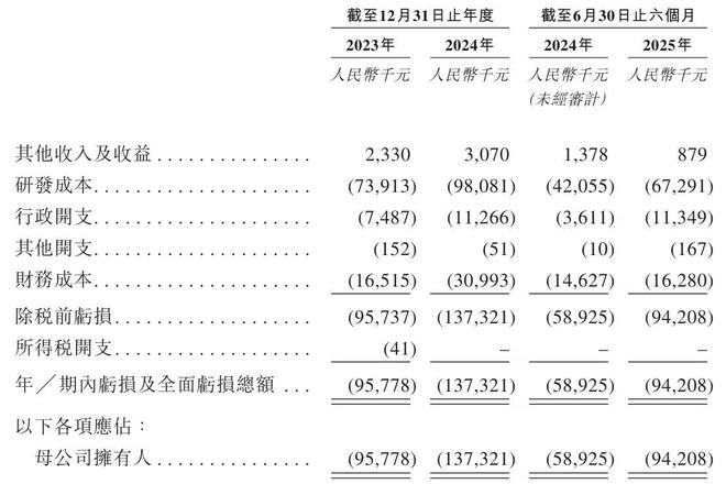 招股书显示,天辰生物2023年、2024年其他收入及收益分别为233万元、307万元;研发成本分别为7391万元、9808万元;行政开支分别为749万元、1127万元;期内亏损分别为9578万元、1.37亿元。
