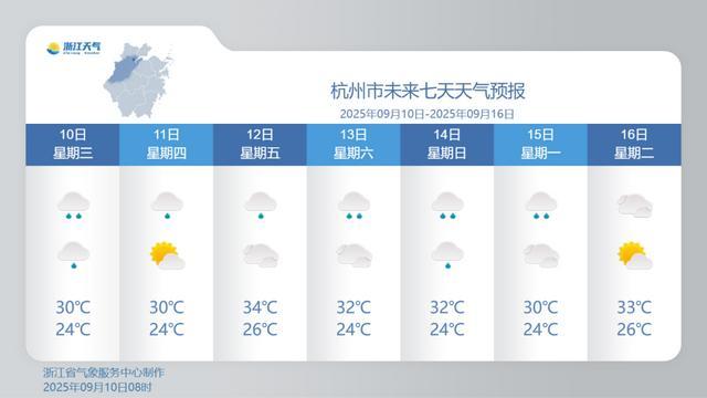 三是9月上旬高温日数的最新纪录为今年的8天。此外,截至9月9日,杭州今年的高温日数已达到57天,就算后续再没有高温日出现,杭州今年的高温日数也毫不逊色,目前已跻身历史年高温日数榜榜三! 这两天杭州的最高气温从前天(8日)的39.4℃到昨天的32.9℃,这波气温“过山车”也太刺激了吧!大家是不是也像小编一样,想多多体验一下这样的“过山车”呢?从目前的预报来看,未来七天最高气温都在32~34℃左右,虽然没有大幅度的降温,但相比于前段时间动辄38、39℃的连续高温,这样的气温也算是比较“舒适”了。