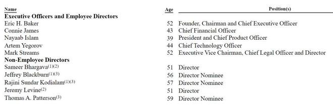 IPO前,Eric H. Baker持有5.2%的A类股,及100%的B类股,有90.4%的投票权;公司总裁、首席产品官Nayaab Islam持有2.4的A类股。