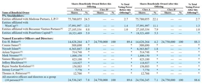 IPO后,Eric H. Baker持有4.2%的A类股,及100%的B类股,有88.3%的投票权;Nayaab Islam持有1.8的A类股。