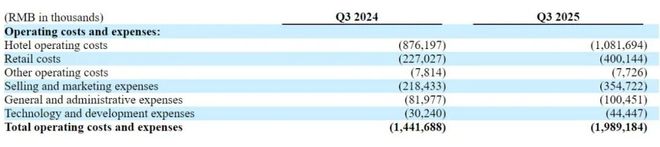 亚朵2025年第三季度酒店运营成本(Hotel operating costs)为10.82亿元,上年同期为8.76亿元;零售成本为4亿元,上年同期为2.27亿元;销售与市场成本为3.55亿元,上年同期为2.18亿元;管理成本为1亿元,上年同期为8198万元;技术研发成本为4445万元,上年同期为3024万元。