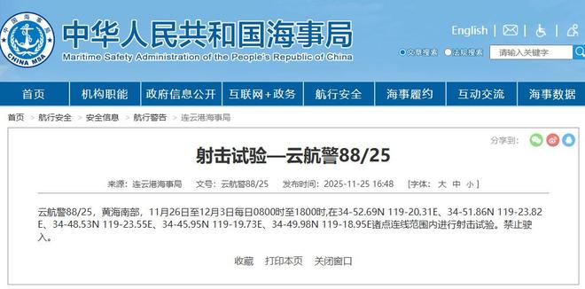据中国海事局网站消息,连云港海事局发布航行警告,11月26日至12月3日每日8时至18时,在黄海南部部分海域范围内进行射击试验,禁止驶入。