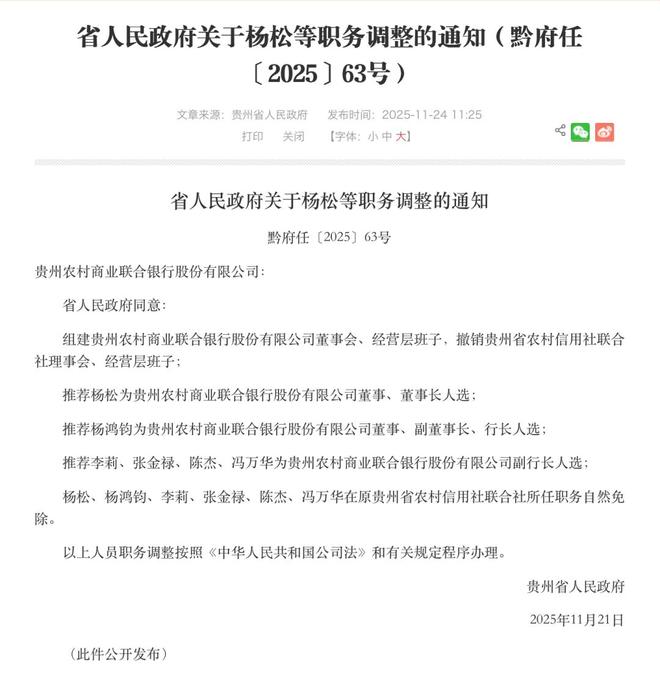 《通知》显示,贵州省政府同意组建贵州农村商业联合银行股份有限公司董事会、经营层班子,撤销贵州省农村信用社联合社理事会、经营层班子;