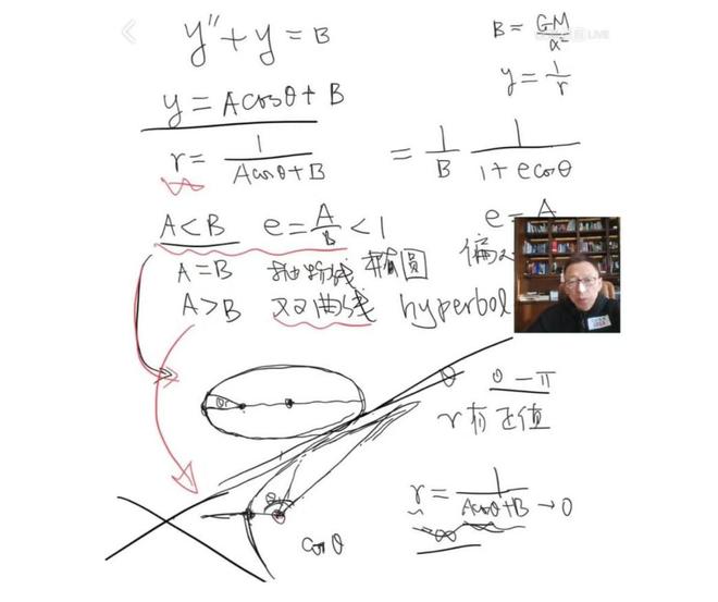 本次课程聚焦分析3I/ATLAS彗星的轨道。张朝阳表示,这颗彗星并非太阳系的常驻成员,而是一位来自星际空间的“过客”。他在直播课上求解了牛顿引力势中星球轨迹的方程,结果表明轨迹可被分成三类,分别是椭圆、抛物线与双曲线。而3I/ATLAS的轨迹正属于双曲线这一类,它在太阳引力的作用下拐一个大弯,最终会远离太阳系并不再返回。