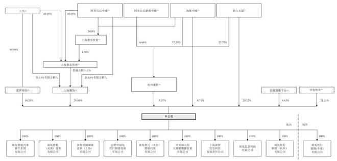 其中,阿里通过上海赛为持股为7.28%,浙江天猫持股为20.32%,有21.91%的投票权;淘宝中国持股为8.71%,有9.39%的投票权;杭州灏月持股为5.37%,有5.79%的投票权。