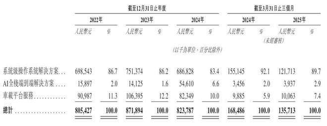斑马智行2025年第一季度系统级操作系统解决方案收入为1.22亿元,较上年同期的1.55亿元下降21.3%,占营收的比例为89.7%;